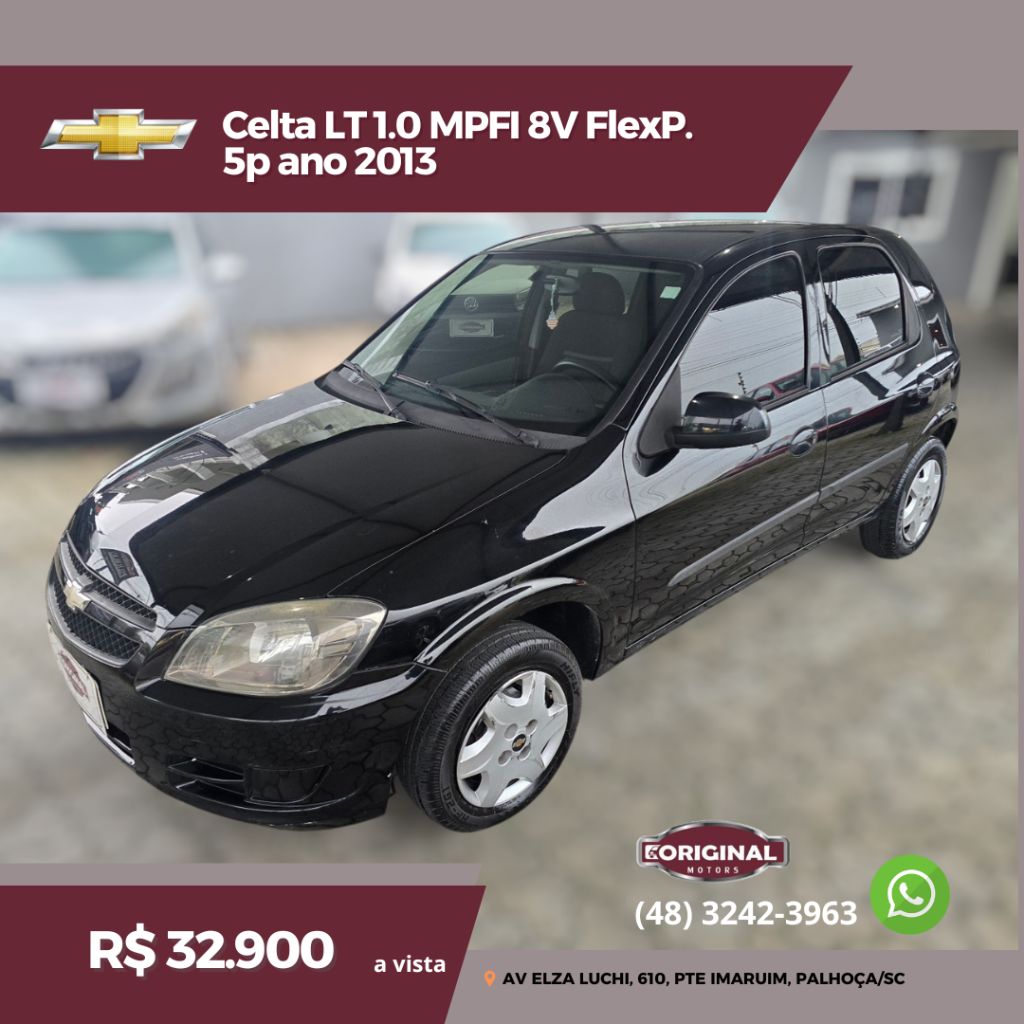 MELHOR OPORTUNIDADE VOCÊ ENCONTRA AQUI, NA ORIGINAL MOTORS!!!! CELTA LT 1.0 MPFI 8V FLEXP. 5P ANO 2013 COMPLETO R$ 32.900,00 somente a vista ou financiado. Na troca falar com a equipe de vendas WhatsApp (48) 3242-3963 Acesse nosso site e conheça nossa loja www.originalmotorssc.com.br Av Elza Luchi 610 Ponte de Imaruim Palhoça- SC